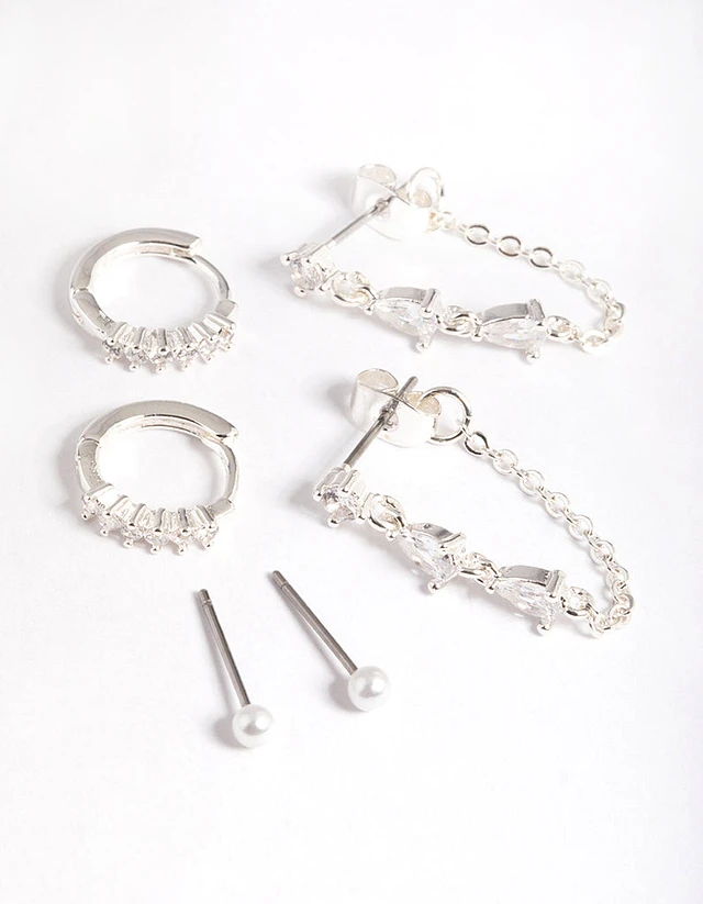 Silver Plated Cubic Zirconia Pave Huggie Chain Earrings 6-Pack