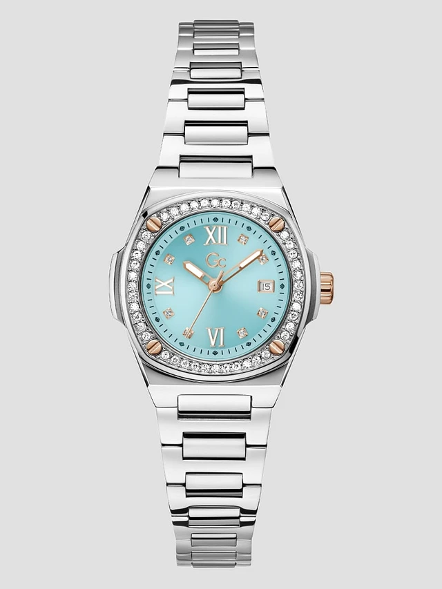 | Swiss made analog watch | Silver-tone body | Bezel encrusted with crystals | Sleek blue dial | Roman numeral and crystal hour markers | Polished chain link bracelet | Stainless steel | Deployment buckle closure | Case diameter in mm: 30 | Water resistant up to 100 m/ 330 ft | 2 year limited warranty