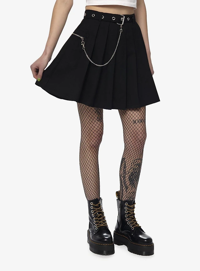 Pink & Black Grid Pleated Skirt With Grommet Belt
