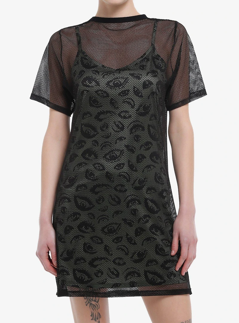 Have all eyes on you when you rock this stylish twofer dress! It features a cami slip dress with eyes printed all over, plush a mesh T-shirt styled dress layer on top.