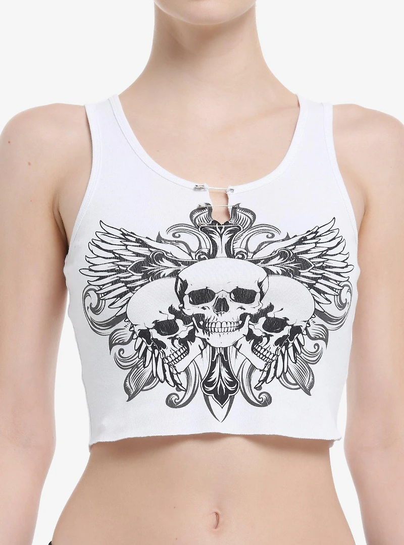 Look like a bone-a-fide baddie with this cropped tank on! It comes in a racerback silhouette with a print of three skulls, wings and filigree. Comes with safety pin details at the neckline.