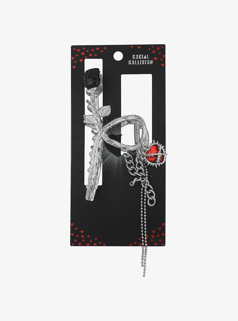 Toughen your updo with this claw clip shaped like a black rose, with chain drops and a spiked heart charm.