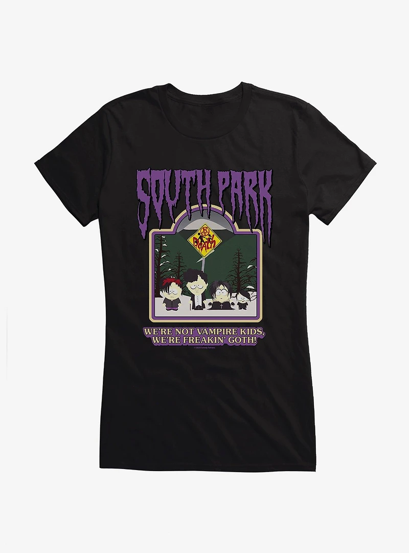 They're not Vampire Kids, they're freakin' Goth! The forever misunderstood Goth Kids -- Pete, Michael, Henrietta and Firkle -- teach us how to be true non-conformists on this fitted South Park tee.
