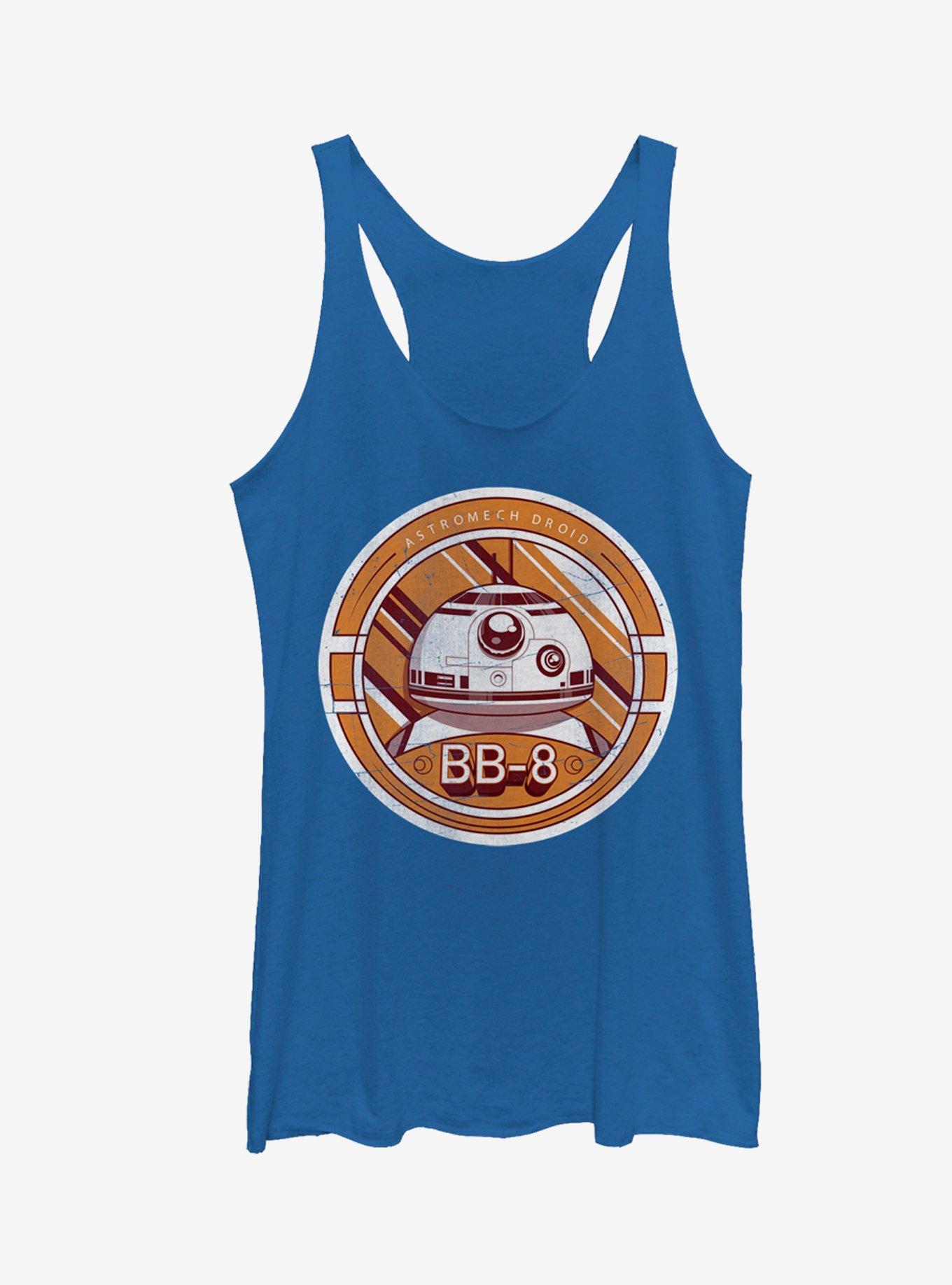 Looking for droids? Look no further than the Star Wars BB-8 Astromech Droid Round Heather Royal Blue Racerback Tank Top. A round distressed print on the front of this awesome blue BB-8 shirt reads "Astromech Droid" next to the newest droid on the block: BB-8. 50% Polyester, 25% Cotton, 25% Rayon.