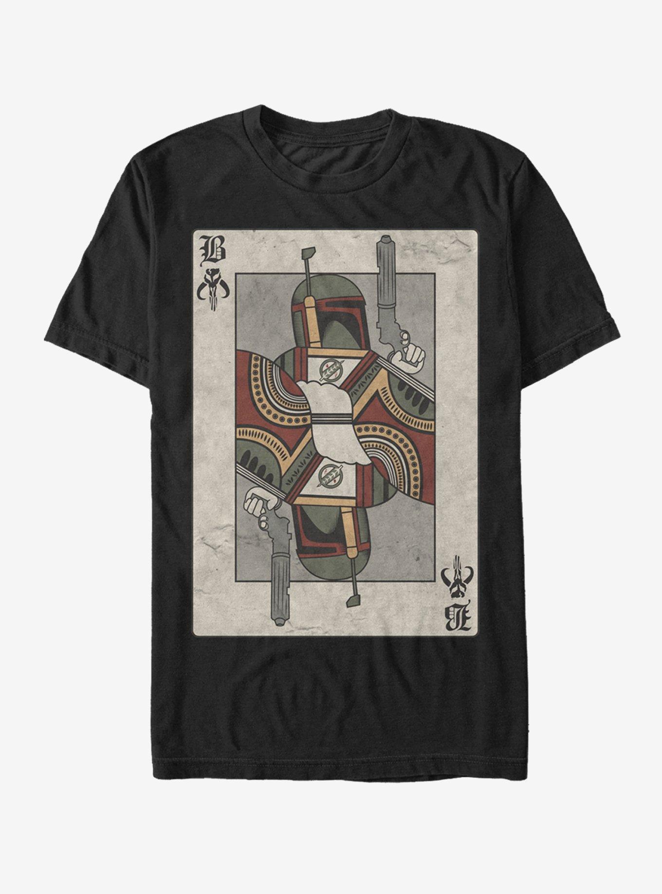 Keep a card up your sleeve and increase your bounty hunter cred with this Star Wars shirt. A lightly distressed print on the front of this unique black Boba Fett tee features a playing card with Boba Fett in his famous Mandalorian armor.