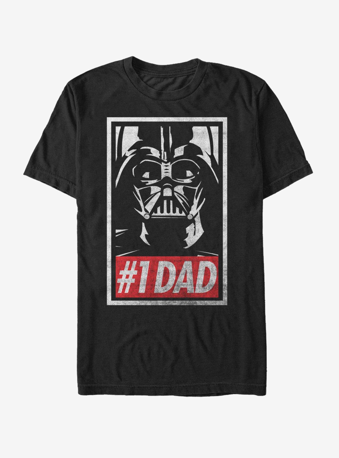 Fathers from galaxies near and far are fans of this Darth Vader tee! A distressed black, white, and red print shapes a poster-style print of Vader with "#1 Dad" on the front of this funny Star Wars shirt.