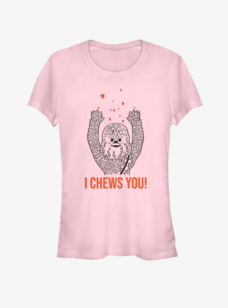 One big, hairy Wookiee lookin' for love! This fitted Star Wars tee features Chewbacca proclaiming, "I Chews You" with arms aloft and hearts soaring overhead.
