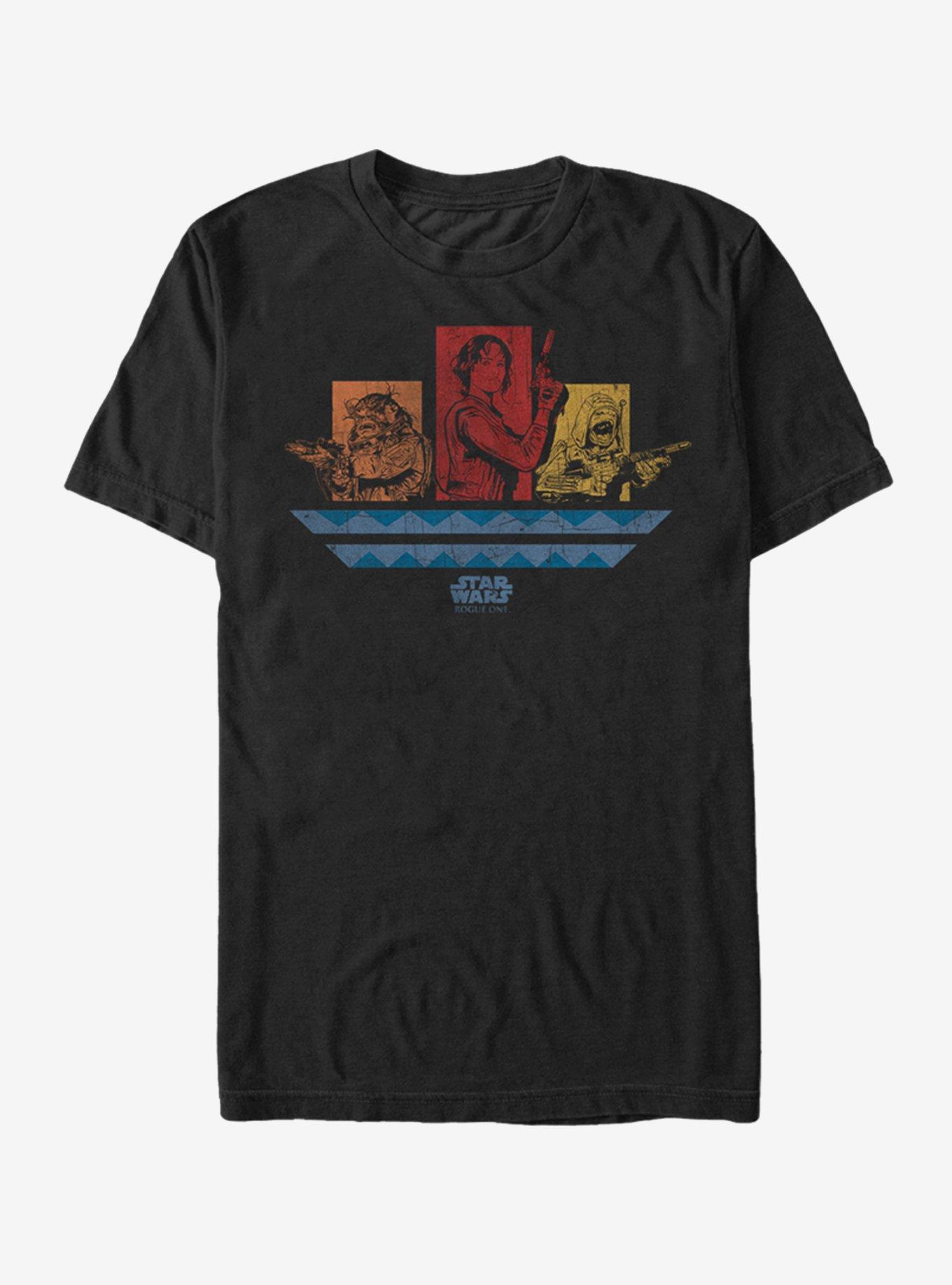 Jyn has nothing to worry about because Pao, Bistan, and the Star Wars Rogue One Jyn Pao Bistan Panels Black T-Shirt has her back! A cool distressed print shows Jyn and her aliens team members, Pao and Bistan, with their weapons ready on this cool black Jyn shirt. 100% Cotton.