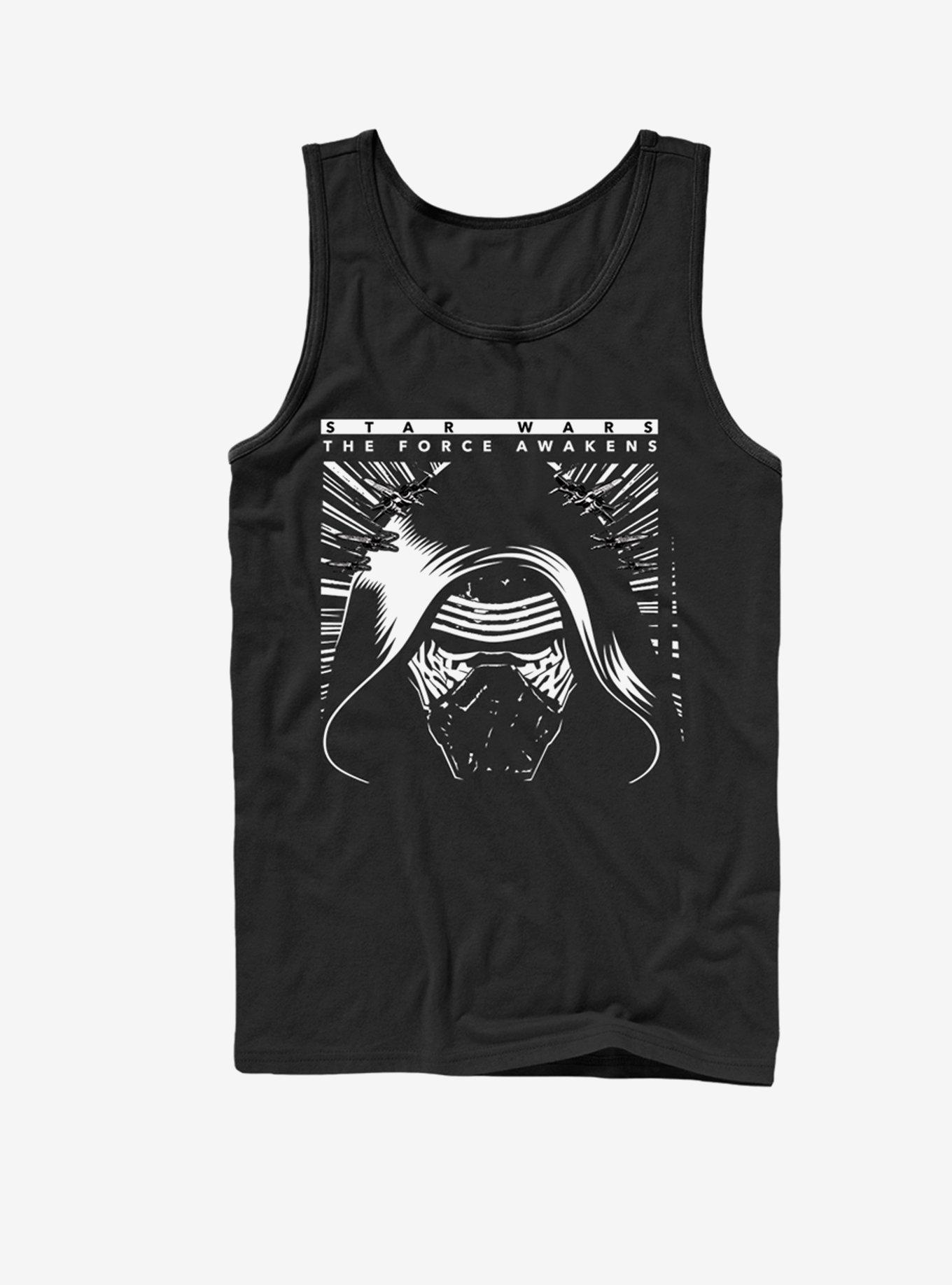 There has been an awakening and the Star Wars Kylo Ren X-Wings Black Tank Top has felt it. A black and white print on the front of this awesome black Star Wars Episode 7 shirt features Kylo Ren and X-Wing fighters printed below the Star Wars: The Force Awakens logo. 100% Cotton.