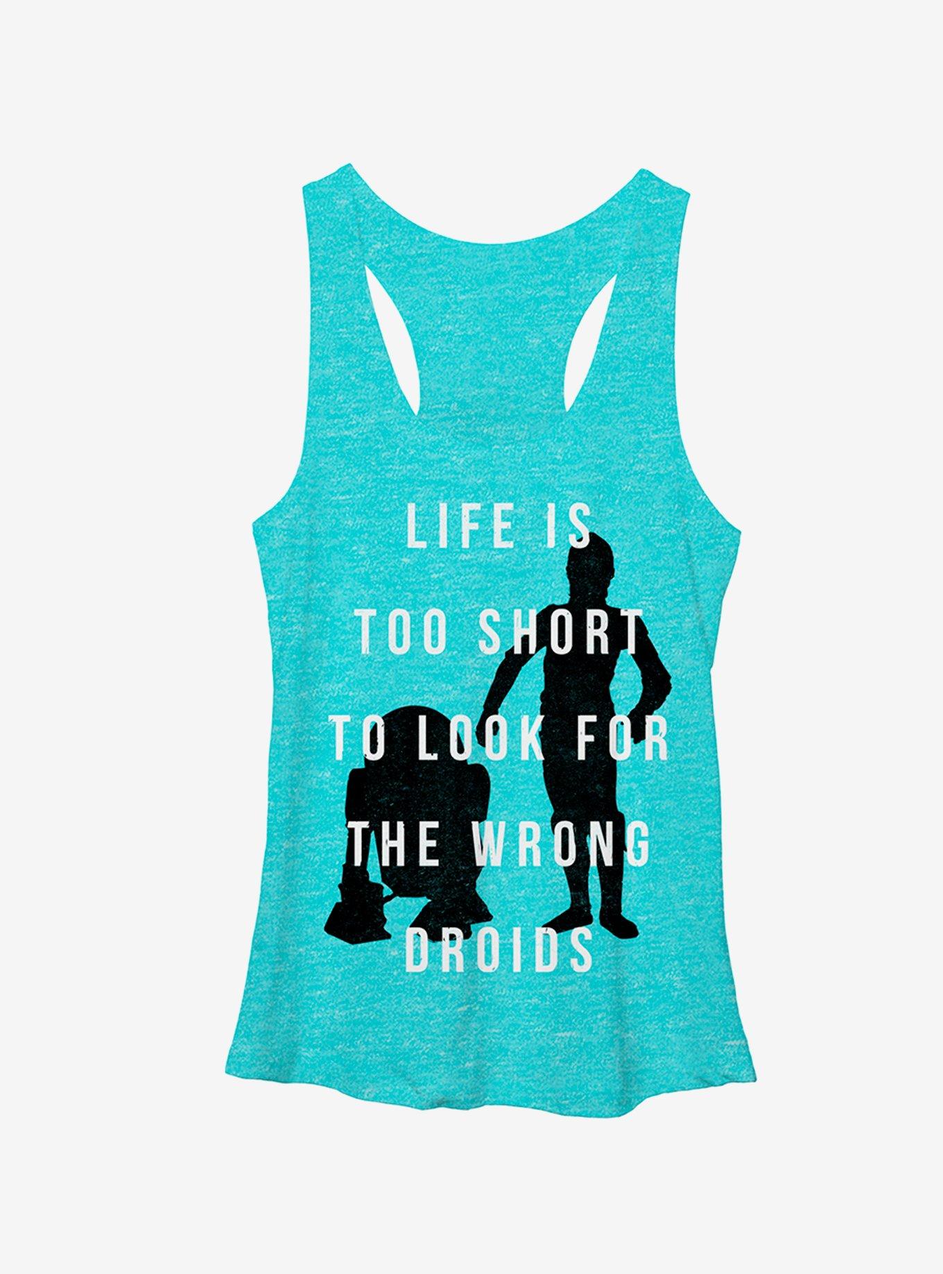 Been looking for droids in Alderaan places? Next time, start with the Star Wars Looking For Droids Heather Turquoise Racerback Tank Top. C3PO and R2-D2 are printed in all black, creating a backdrop for the text "Life is too short to look for the wrong droids." 50% Polyester, 25% Cotton, 25% Rayon. Designed with raw-edge hems.