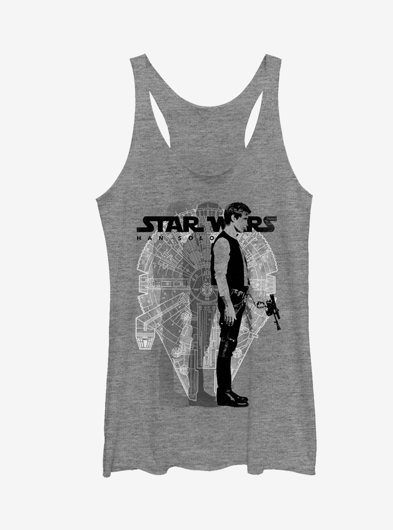 Your days of being a scruffy-looking nerd herder are at an end thanks to the Star Wars Millennium Falcon Han Solo Heather Gray Racerback Tank Top! A lightly distressed black and white print on the front of this epic Han Solo shirt features the Millennium Falcon printed next to Han Solo holding his blaster and "Star Wars Han Solo" in black letters. 50% Polyester, 25% Cotton, 25% Rayon. Designed with raw-edge hems.