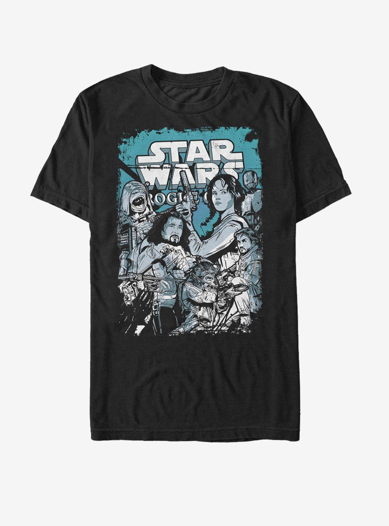 Help steal the plans for the Galactic Empire's new weapon, the Death Star, and do it in style with the Star Wars Rogue One Rebel Comic Book Print T-Shirt! This cool black Rogue One shirt features the Rebel Alliance's most elite members like Chirrut Imwe, Captain Cassian Andor, Jyn Erso, and Baze Malbus in a fun comic book style print. 100% Cotton.