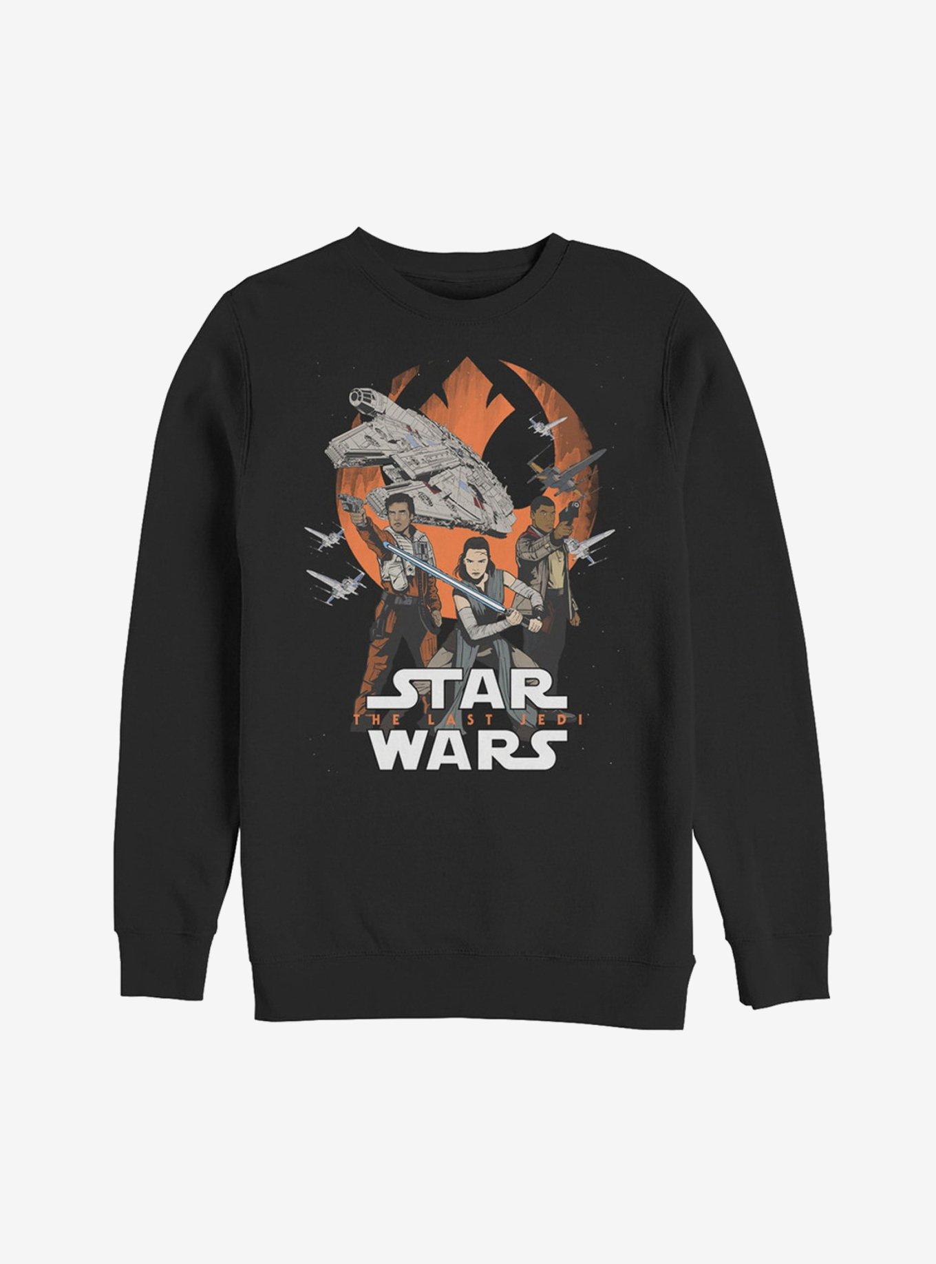 The Resistance needs all the help it can get so grab your Star Wars The Last Jedi Rebel Trio Black Sweatshirt and get ready! The resistance emblem is printed in distressed orange while Rey, Poe, Finn, and the Millennium Falcon are featured cross the front of this cool black Episode VIII sweatshirt. 50% Cotton, 50% Polyester.