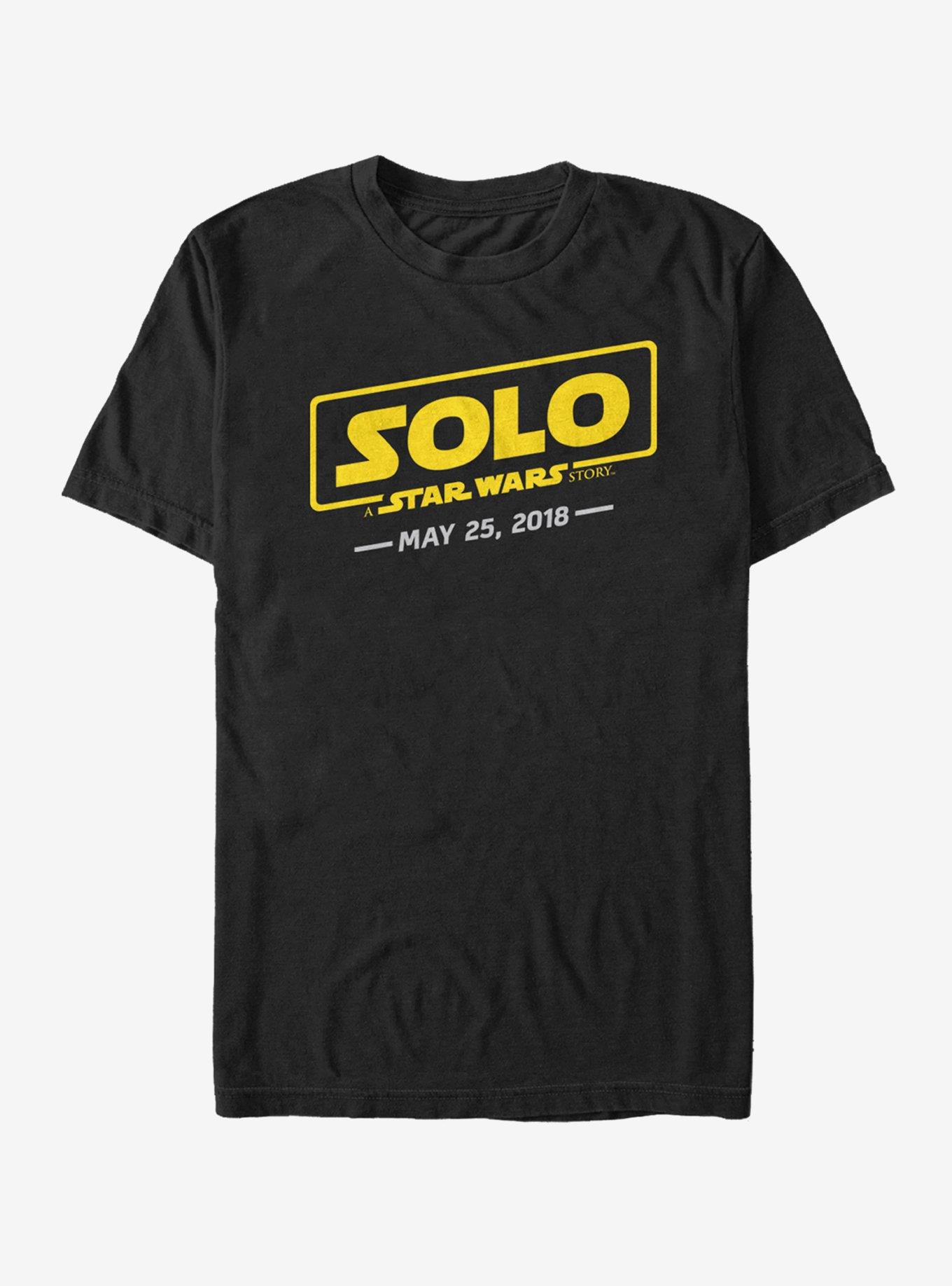 Get your engines ready for the space western of the century with the Solo: A Star Wars Story Logo Scrawl Men's T-Shirt. A classic gold font Solo: A Star Wars Story logo is featured with the movie release date "May 25" across the front of this unique men's Star Wars shirt.