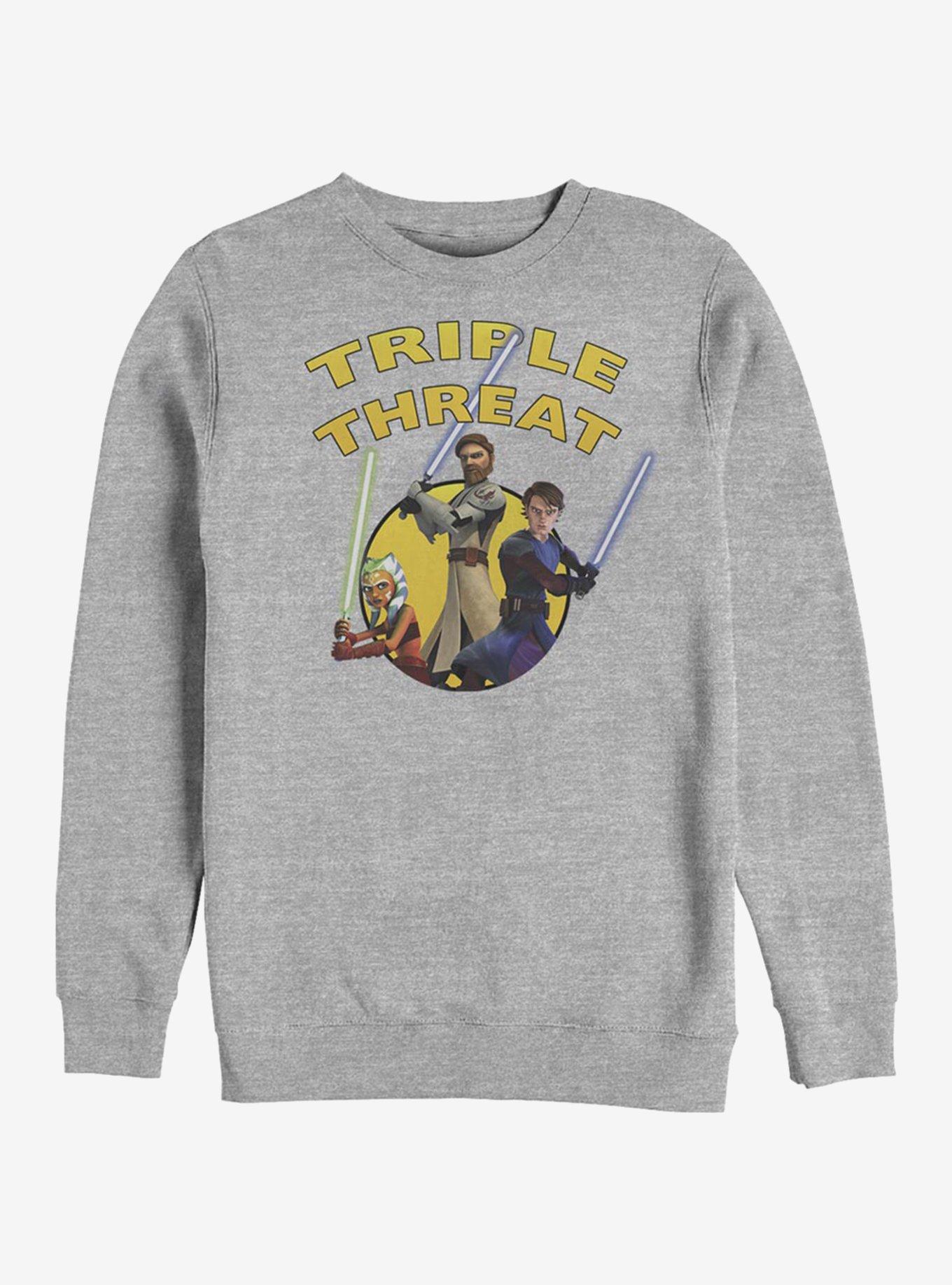 Best of three! This heather grey crew sweatshirt -- inspired by Star Wars: The Clone Wars -- features a triple threat to the Dark Side: Obi-Wan Kenobi, Anakin Skywalker and Ahsoka Tano.