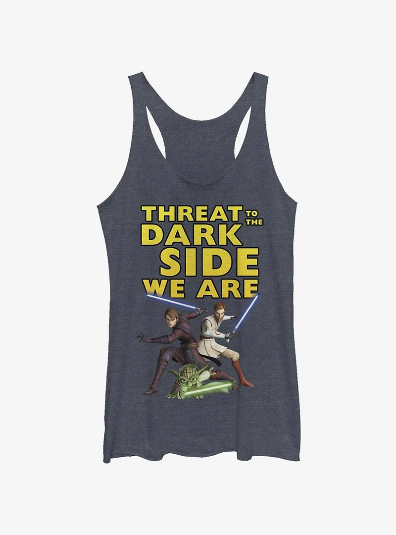 The Force, they have! This heather navy blue Star Wars tank features Anakin Skywalker, Obi-Wan Kenobi and Yoda -- with "Threat to the Dark Side, we are" verbiage.