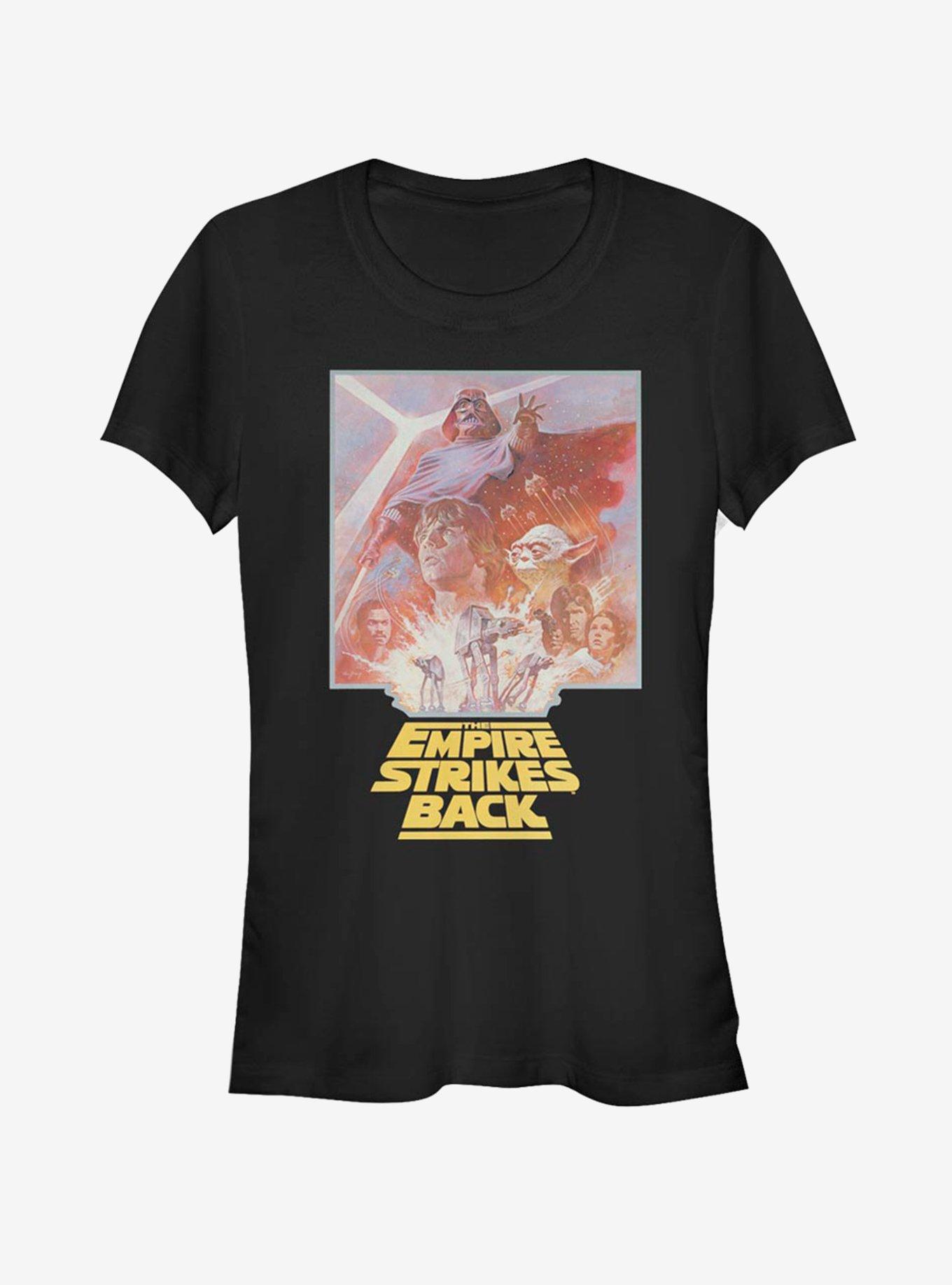 The Star Wars saga continues! This fitted black tee has poster art from Episode V - The Empire Strikes Back featuring Darth Vader, Luke Skywalker, Yoda, AT-AT walkers and more.