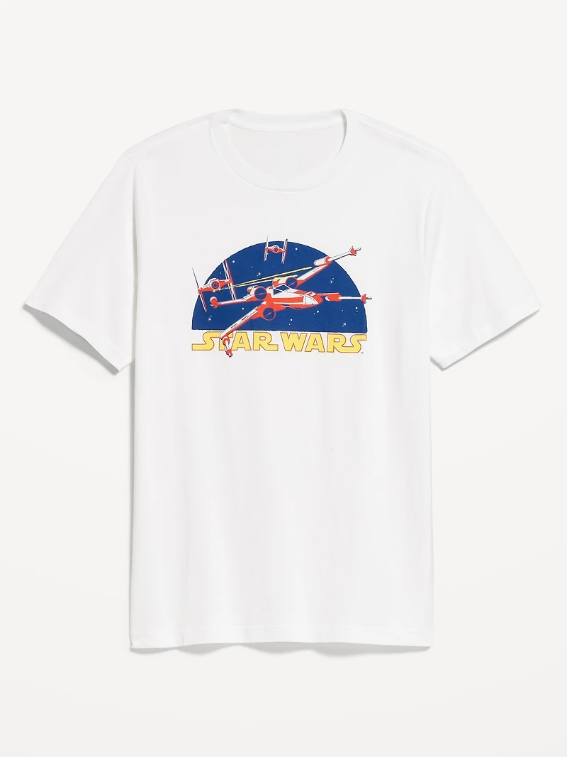 rib-knit crew neck short sleeves licensed logo graphic © & ™ Lucasfilm, Ltd relaxed fit hits below waist t-shirt uses our standard men's sizingmachine wash according to the care instruction label .