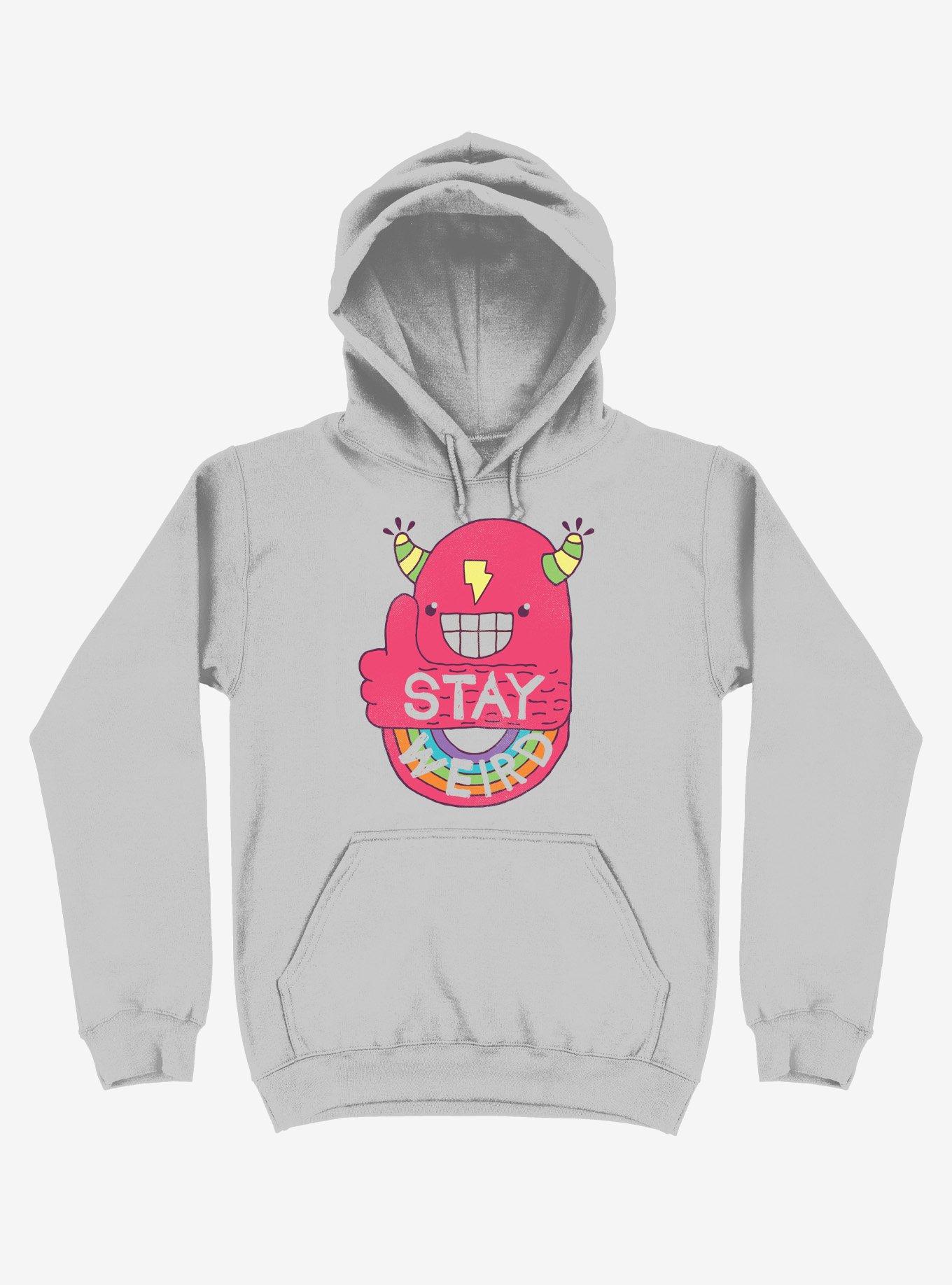 If being weird is wrong, we don't wanna be right. This silver pullover hoodie has pouch pockets and a rainbow, lightning bolt, and weird dude graphic. Avoid the norm - stay weird! Officially licensed art from beanepod.