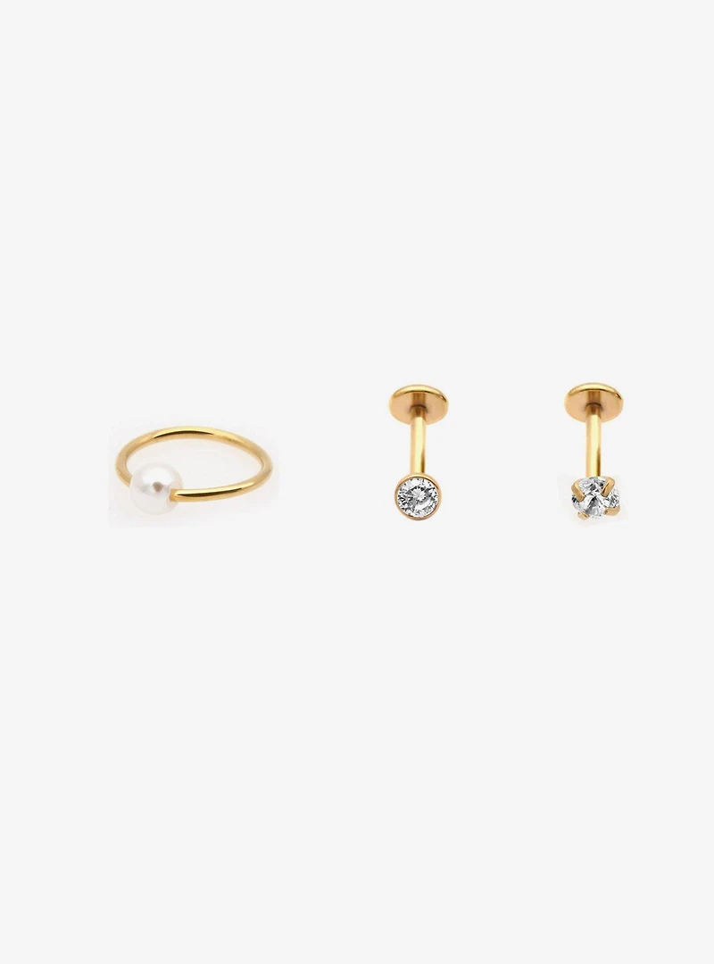 Keep your body jewelry looking classy! Steel gold designs with 2 labret studs with gem detailing and 1 gold-tone hoop with a faux pearl. Jewelry care: Wash with antibacterial soap and warm water. Piercing care: Wash hands thoroughly, then clean piercing with H2Ocean (sold separately) or saline solution.
