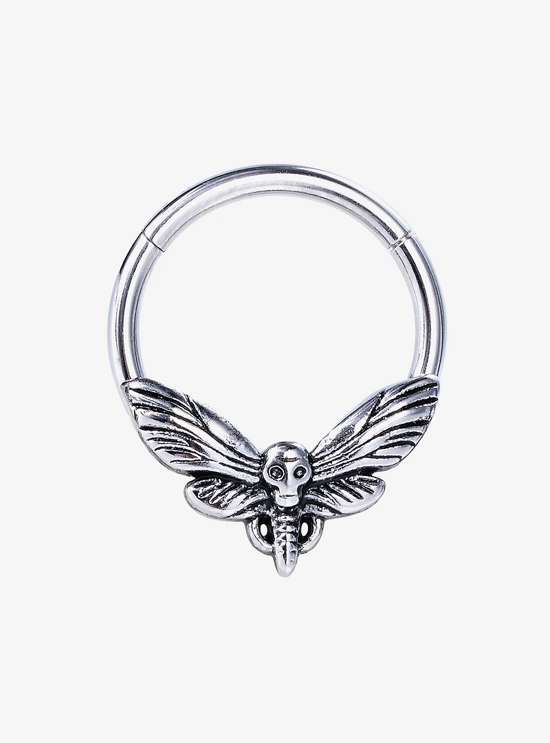 Silver-tone hinged clicker with a death moth design. Jewelry care:  Wash with antibacterial soap and warm water. Piercing care:  Wash hands thoroughly, then clean piercing with H2Ocean (sold separately) or saline solution.