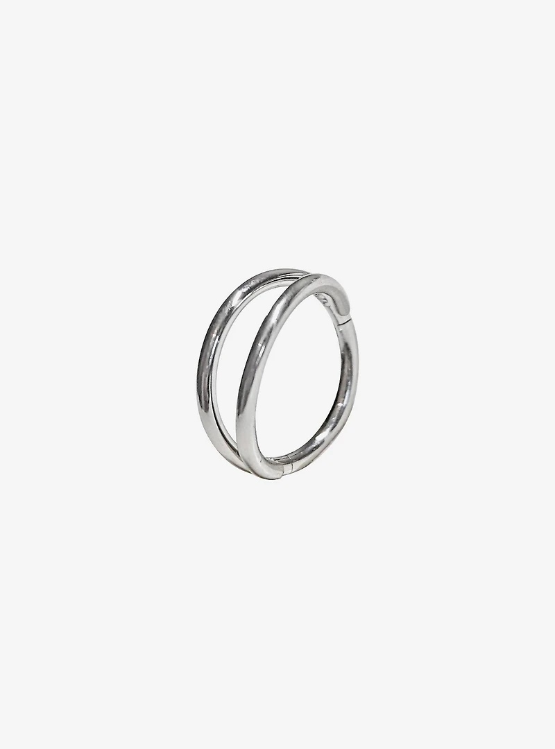 Silver-toned hinged clicker with double hoop design. Jewelry care: Wash with antibacterial soap and warm water. Piercing care: Wash hands thoroughly, then clean piercing with H2Ocean (sold separately) or saline solution.