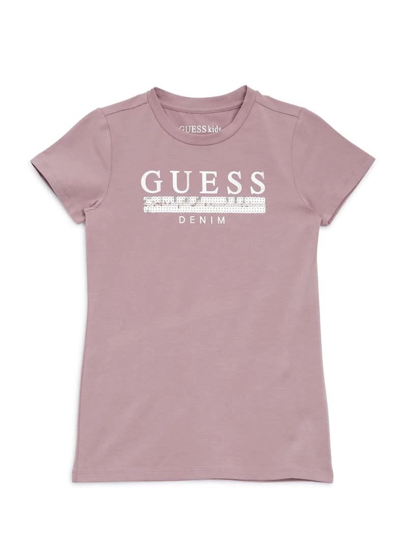She'll shimmer with delight each time she wears this jersey tee featuring a metallic and sequin logo, crew neckline and short sleeves.