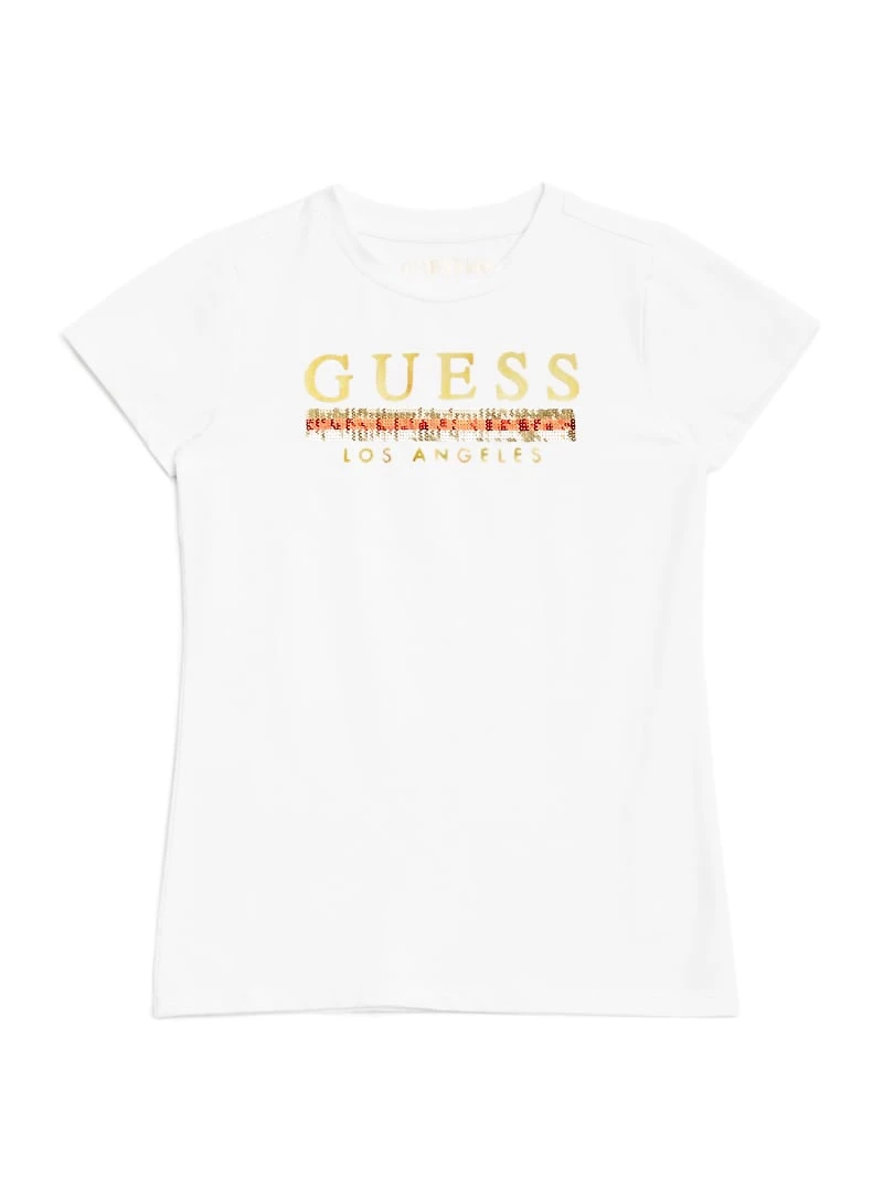 She'll shimmer with delight each time she wears this jersey tee featuring a metallic and sequin logo, crew neckline and short sleeves.
