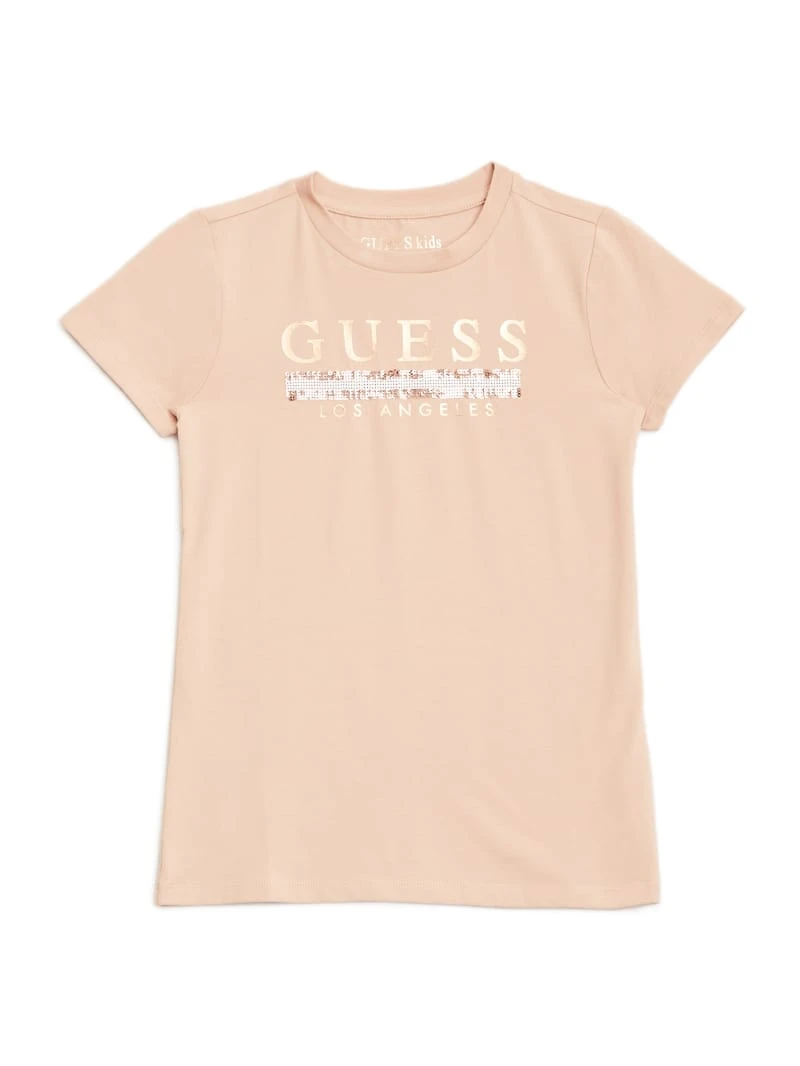 She'll shimmer with delight each time she wears this jersey tee featuring a metallic and sequin logo, crew neckline and short sleeves.