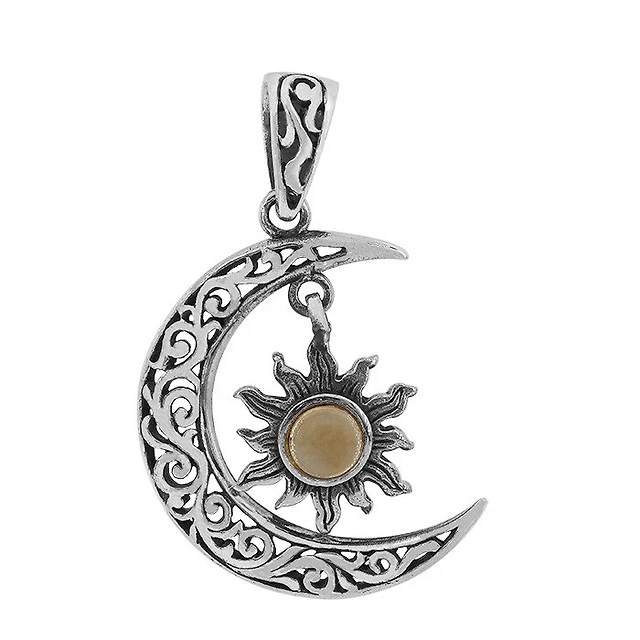 Sterling Silver, 20X25mm Crescent Moon And Sun Pendant With 5mm Citrine
