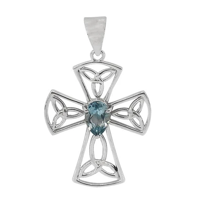 Sterling Silver, 25X33mm Celtic Knot Cross Pendant With 5X7mm Blue Topaz