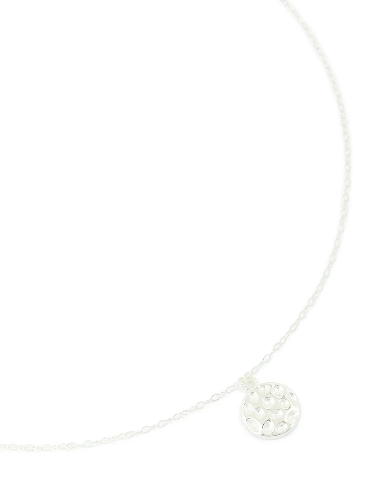 Meet your new go-to piece: this Sterling Silver Molten Round Pendant Necklace. This sleek sterling silver necklace features a modern round pendant with a cool molten-style finish, perfect for adding effortless style to any outfit. Wear this silver pendant necklace with a simple tee and jeans for everyday wear, or layer it with other delicate chains for a chic weekend look. It also pairs beautifully with dresses and workwear, making it a versatile jewellery essential you’ll reach for on repeat. Material: Sterling Silver Colour: Silver Dimensions: Chain Length: 45 cm