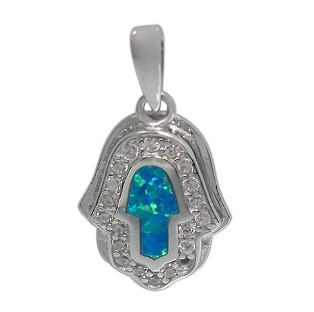 Sterling Silver With Rhodium, 19.5×15.5mm Hamsa Pendant With Cubic Zirconia And Emulated Opal Stone