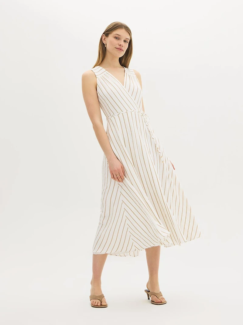 Feminine and effortlessly flattering, this striped dress features a soft cross-over bodice and a flowy textured fabric that moves beautifully. Designed sleeveless with a thin sash at the waist to define the silhouette, it falls into a classic fit-and-flare skirt for an easy, polished finish. A timeless piece for workdays, events, and everything in between.Woven dressStripe dressFlowy textured fabricBack zip closureFront cross-over upperSleevelessThin sash at waistFit and flare skirtIsabelle is 5.8" and wearing size SFabric: 99% polyester, 1% spandexMachine wash inside out in cold waterHang to dry