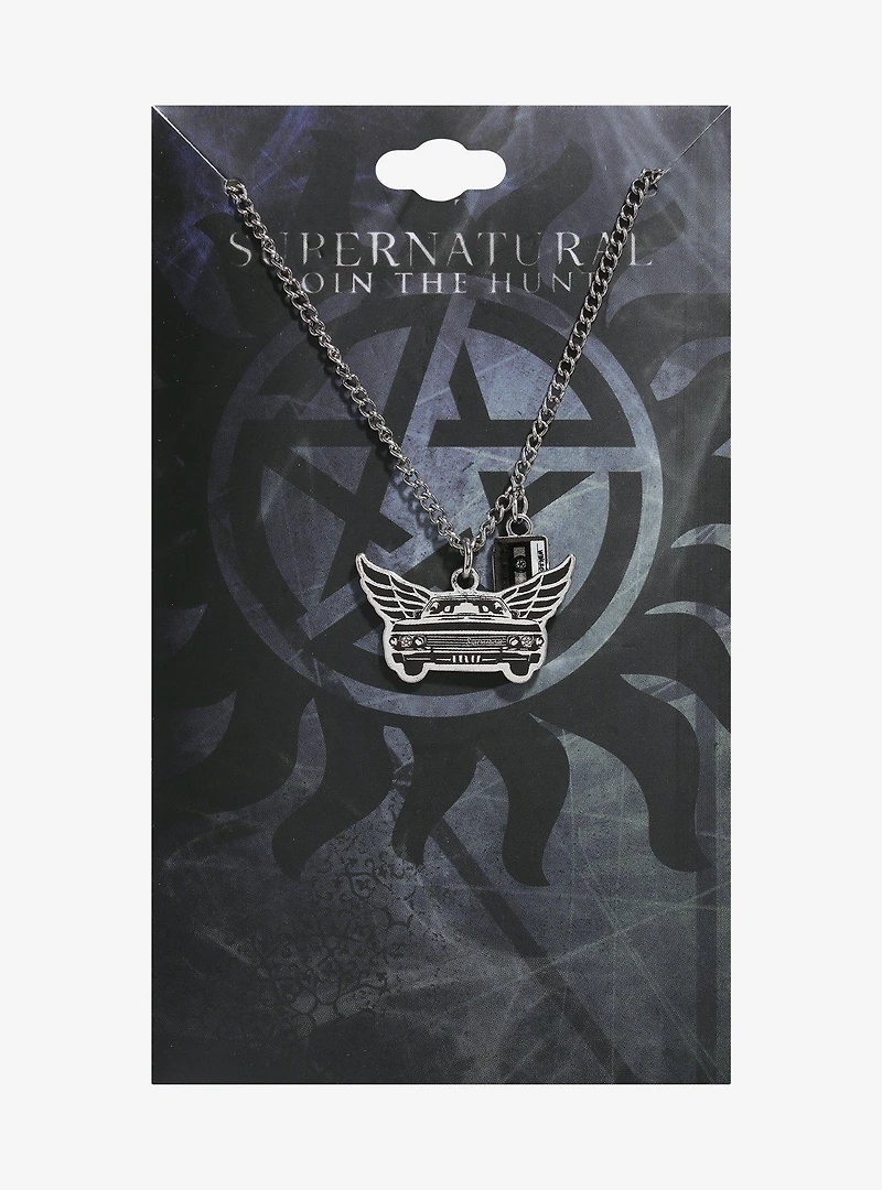 It's just you, cassette tapes, Baby, and this Supernatural necklace against the world. Rep the Winchester brothers with this necklace on, featuring a pendant of Dean's Impala with wings and a cassette tape.