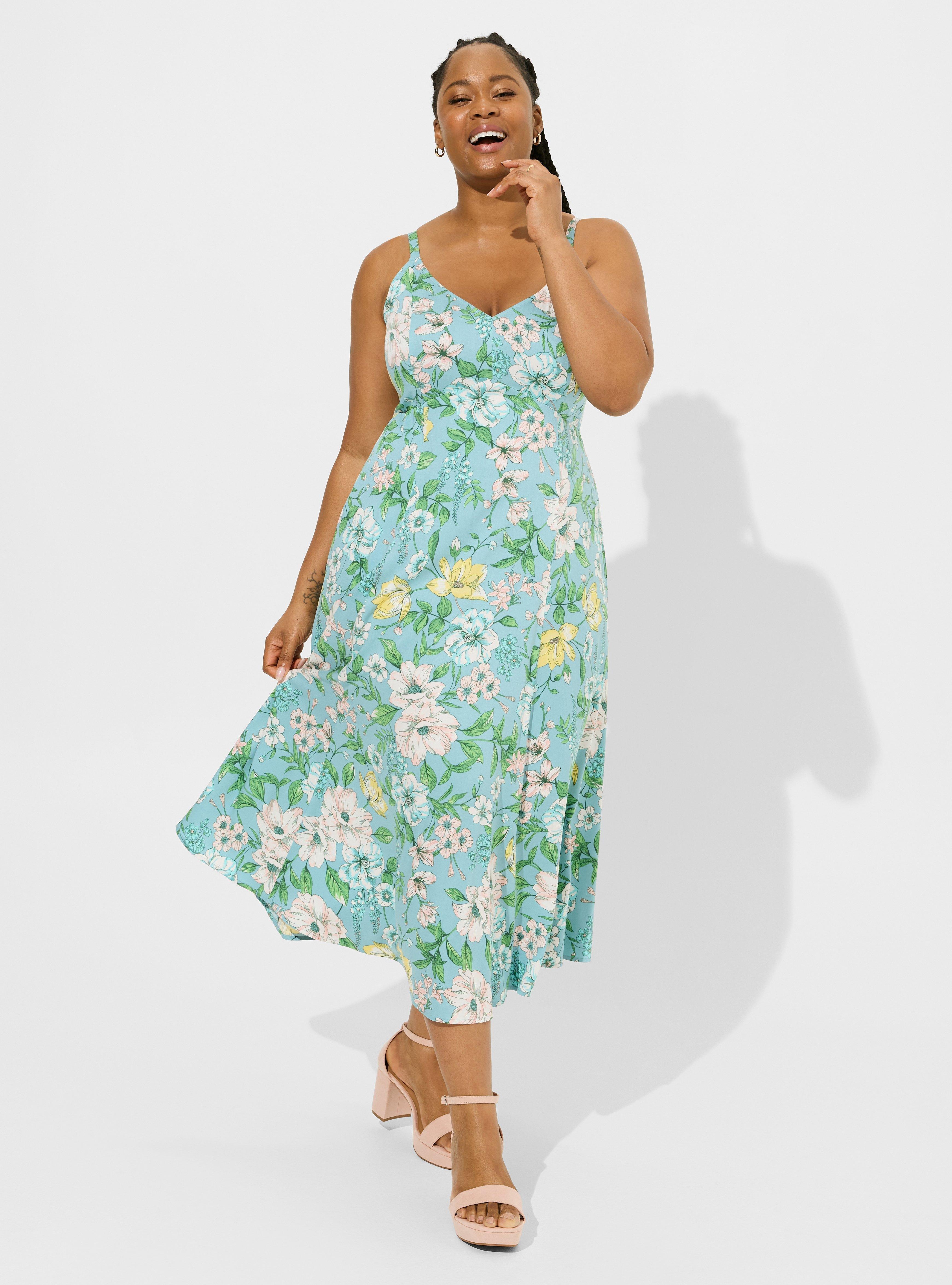 FIT Trapeze fit-and-flare silhouette. Tea length. Measures 52'' from shoulder (size 2). MATERIALS + CARE Stretch challis woven fabric: Your favorite easy-but-polished fabric with the perfect touch of stretch. Stretch level: Medium. 97% rayon, 3% spandex. Machine wash cold. Line dry. Imported. DETAILS V-neck. Sleeveless. Functional pockets. Floral print.