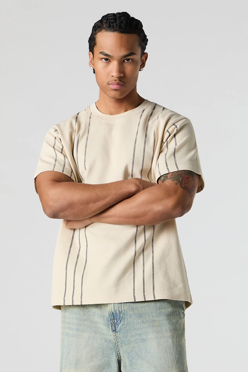 This top features textured material, vertical stripes, crew neckline, and short sleeves.