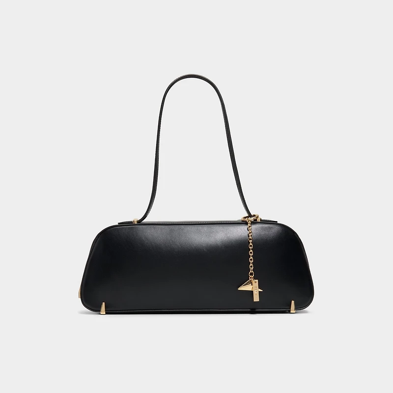 Midnight-smooth leather shapes a baguette silhouette with gilded corner caps, while a dangling A-charm catches light and a hidden zip keeps after-dark essentials secure, guiding you from dinner to rooftop moments with quiet confidence. Tuck it under a blazer for dinner dates, or sling it over a slip dress for rooftop parties, finishing every look with effortless polish.