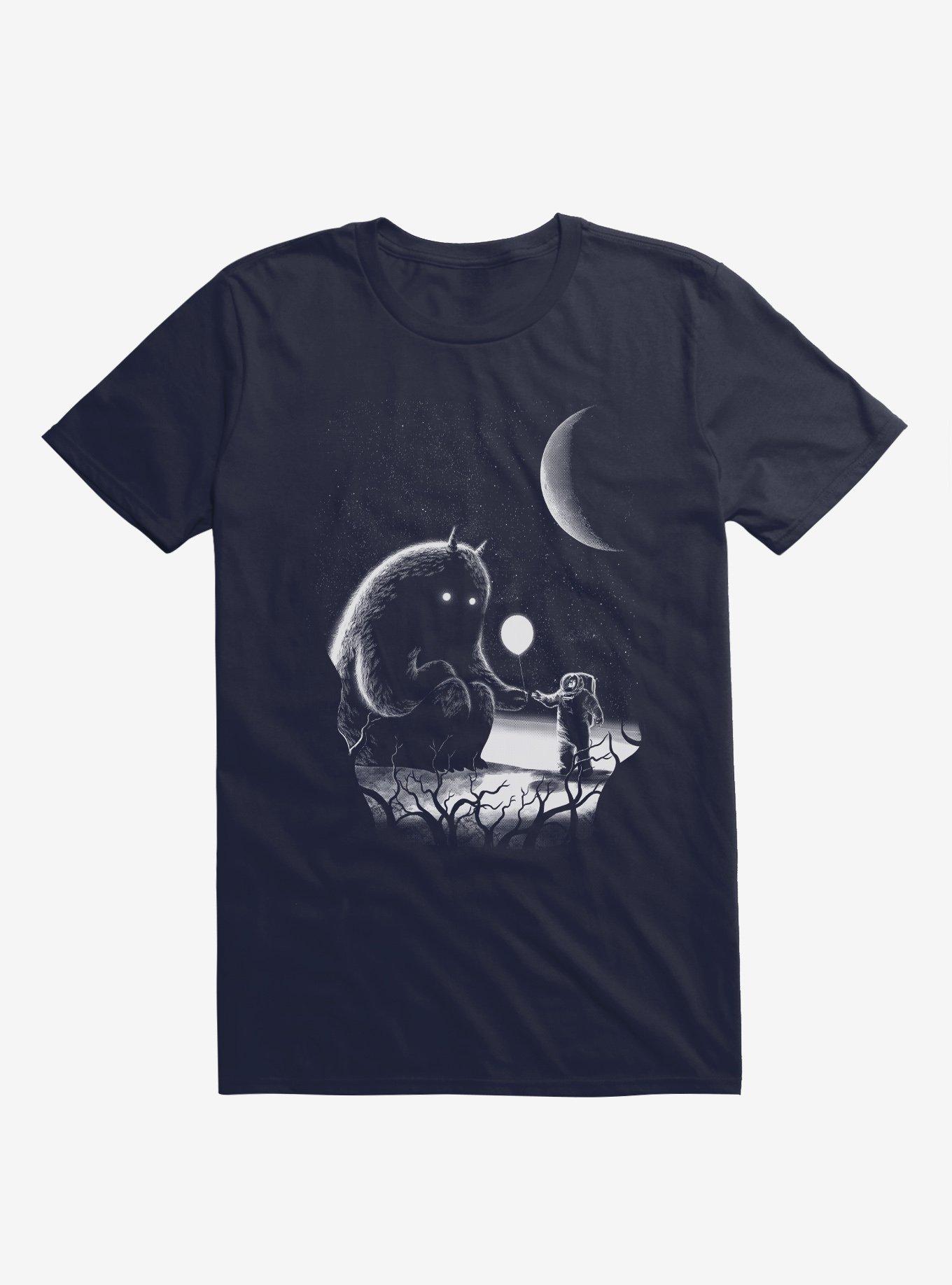 The first guest has arrived - it's an astronaut with a balloon! Aww. This lightweight navy blue tee features a scene on an unnamed planet, with a lonely extraterrestrial and friendly spaceman on a star-filled background. Officially licensed art from Ralph Pykee Lambaco.