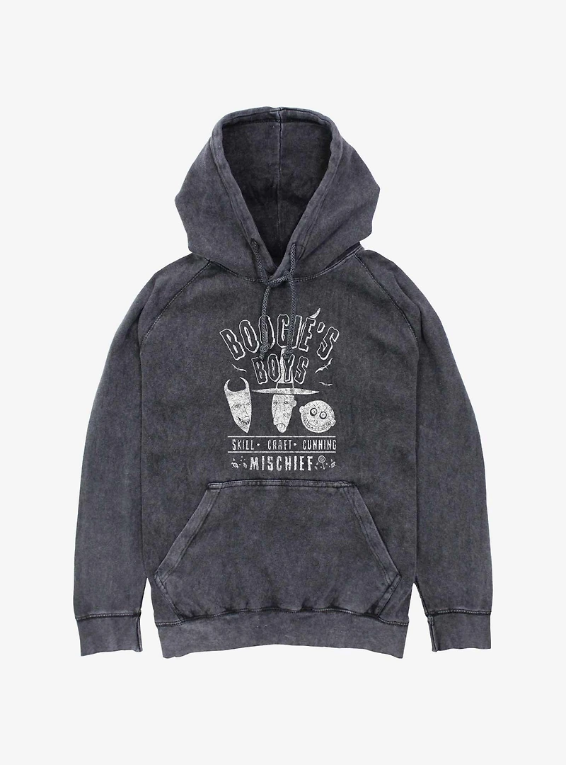 When we throw out words like Skill, Craft, Cunning and MISCHIEF -- who comes to mind? Boogie's Boys, that's who! This mineral washed pullover hoodie takes inspiration from Oogie Boogie's henchmen from The Nightmare Before Christmas : The infamous trick-or-treating trio, Lock, Shock and Barrel.