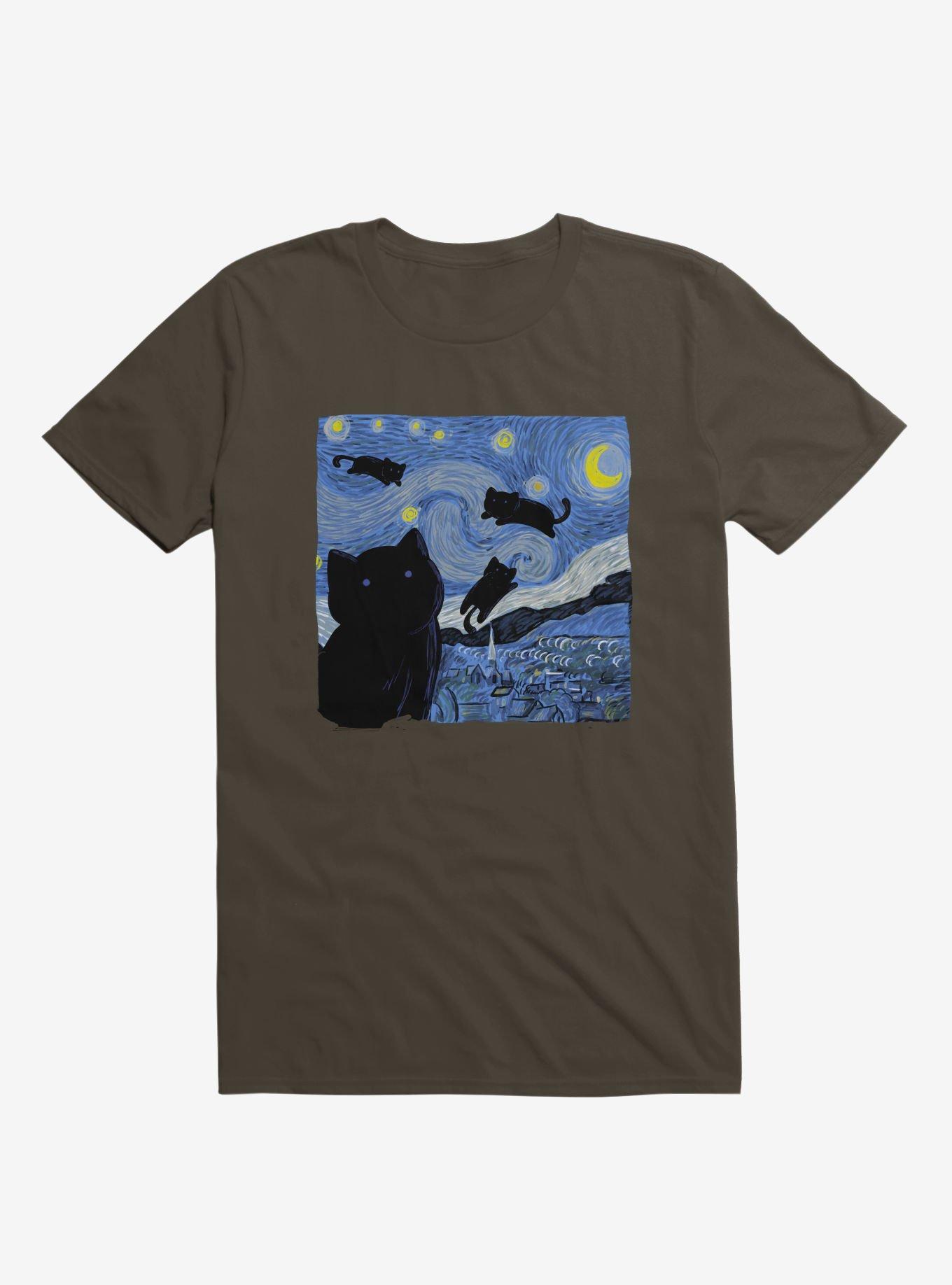 This shirt belongs in a mew-seum! Our lightweight brown graphic tee features black cats napping, playing, and being adorable in an iconic Starry Night-inspired design. Officially licensed art from Tobe Fonseca.