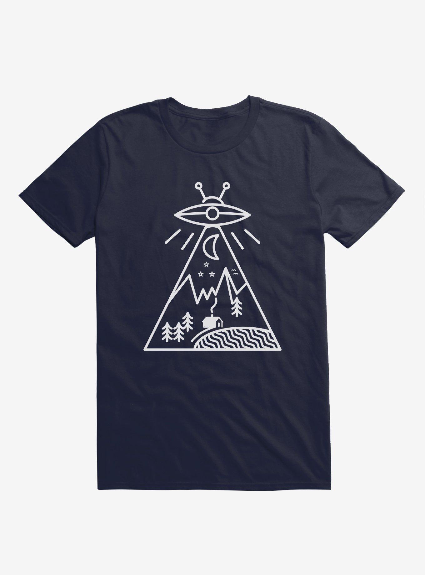 Life origins to a tee. A tranquil mountain scene with the moon, stars, trees, a lake and a cabin appears alongside an otherworldly graphic on this lightweight navy blue T-shirt. Officially licensed art from 38Sunsets.