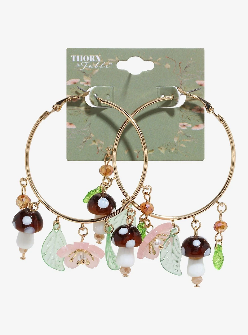 Embrace the whimsical cottagecore aesthetic with these gold-tone hoop earrings! They come with dainty sakura flower, mushroom and leaf charms.