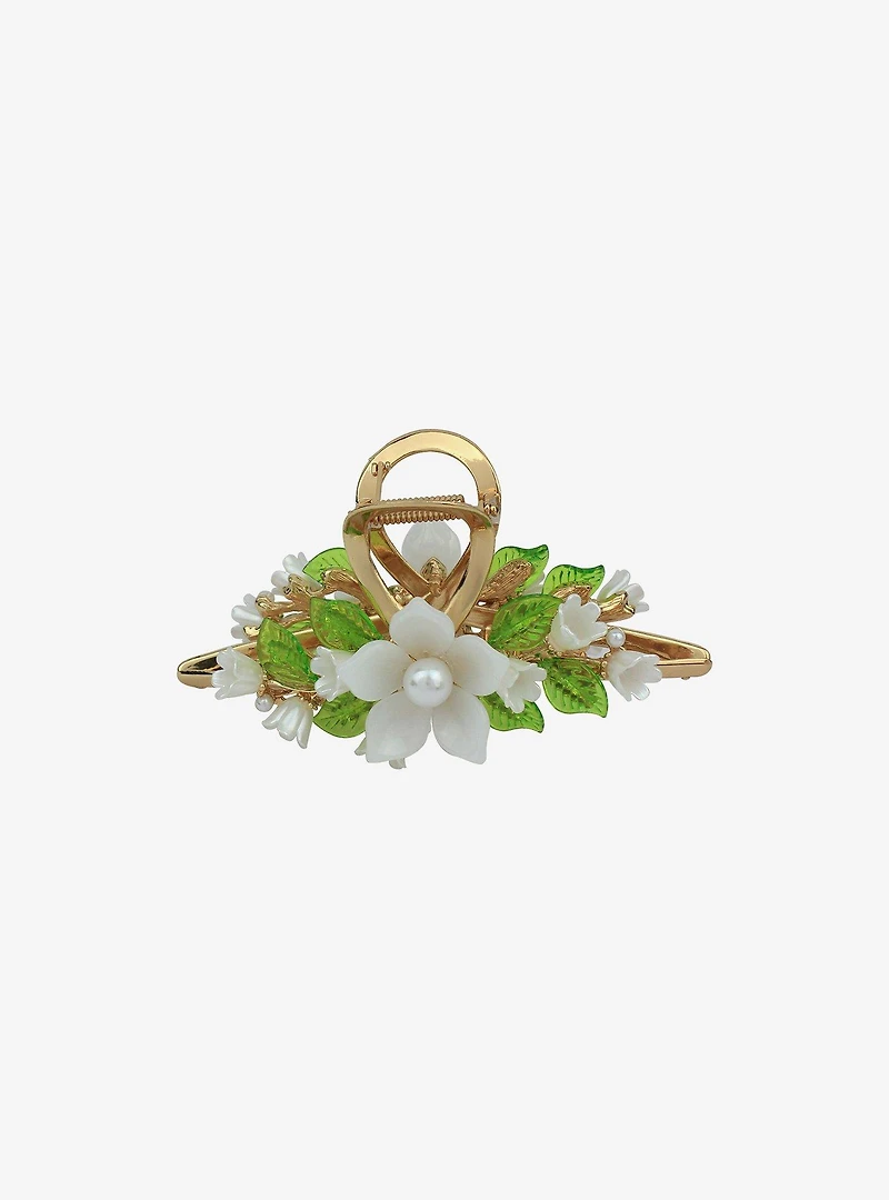 Bring some delicate florals to your look with this claw clip. It is gold-toned and decorated with white flower beads and leaf beads.