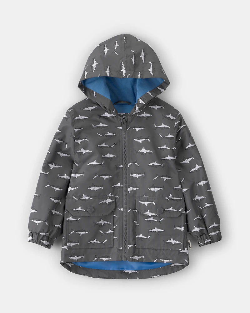 Rainy days just got a lot more exciting. This slate -coloured jacket features a playful shark print . Designed for comfort and ease, it slips on effortlessly, ensuring your little one stays dry and stylish. The lightweight, breathable fabric is perfect for layering, while the vibrant blue lining adds a fun pop of colour. Ideal for spring showers or fall breezes, this jacket keeps kids cozy without compromising on style. Parents will appreciate the durable design, ready for all-day play.