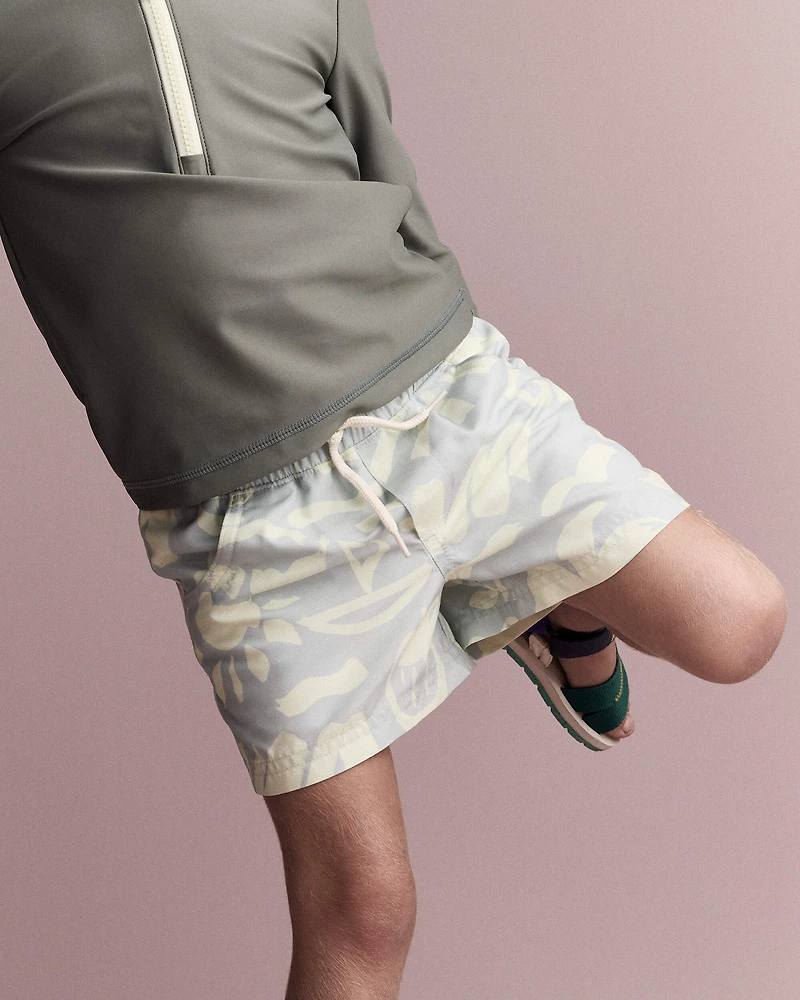 Poolside chillin'. He can dress himself. Easy on stretchy waistband. Functional drawstring. Classic shorter look. Mesh liner. Two mesh pockets, too. Abstract summer fruit print = all eyes on him. UPF 50+ sun protection for peace of mind on extra sunny days. Toddler-friendly taglessness? No question.