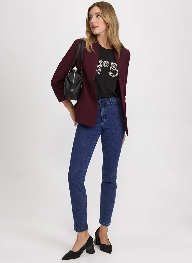 Twill 3/4 Sleeve Blazer & Rhinestone Embellished Jeans