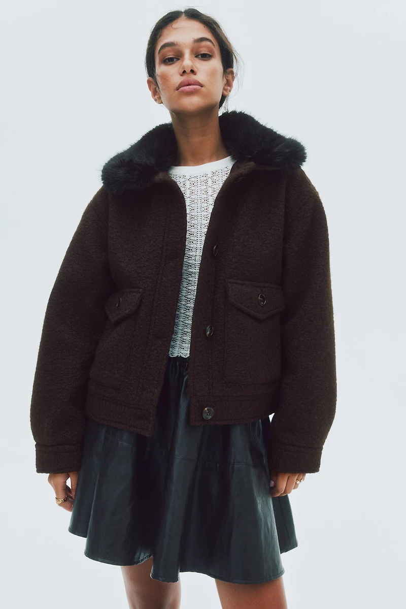 Loose-fit jacket in twill with a brushed finish. Fluffy, detachable collar, buttons at front, front pockets with flap and button, and a yoke at back. Dropped shoulders and button at cuffs. Lined.