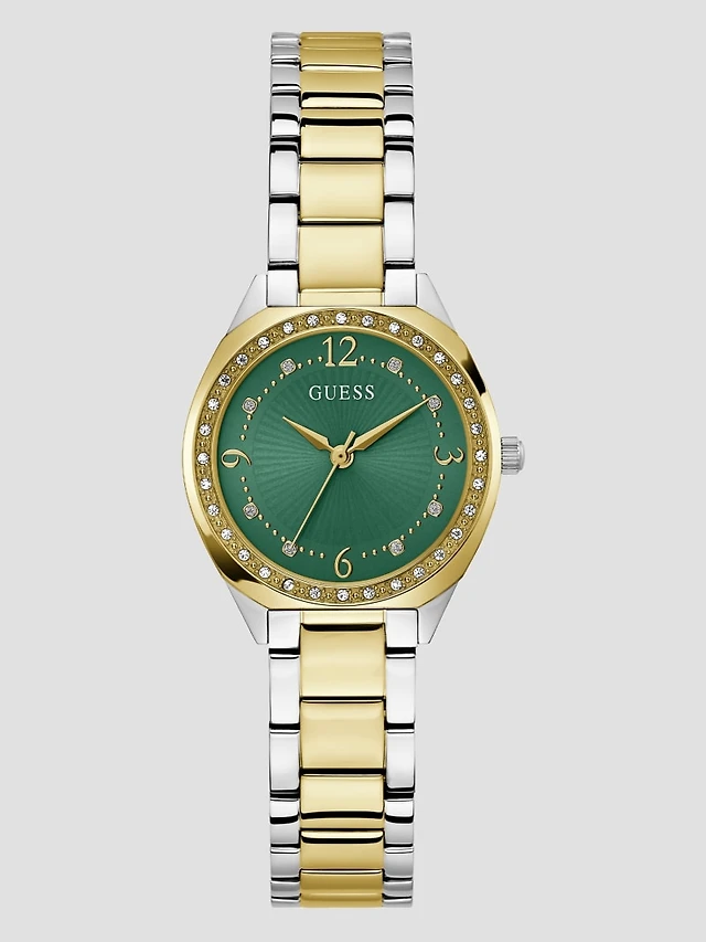 | Silver and gold-tone green analog watch | Gold-tone case and round bezel embellished with crystals | Radial green dial | Minimalist hour markers detailed with crystals | Polished stainless steel link bracelet | Deployment buckle closure | Case diameter in mm: 30 | Water resistant up to 30 m/ 98 ft | 2 year limited warranty
