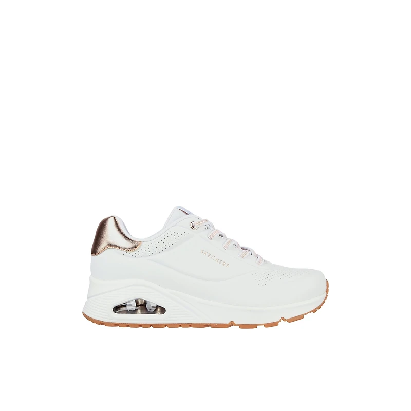 Level up your sneaker game with cushioned comfort wearing Skechers Street™ UNO Gen1 - Shimmer Away. This lace-up fashion sneaker features a synthetic duraleather upper with metallic trim, Skechers Air-Cooled Memory Foam® comfort insole, and a visible Skech-Air® airbag midsole.